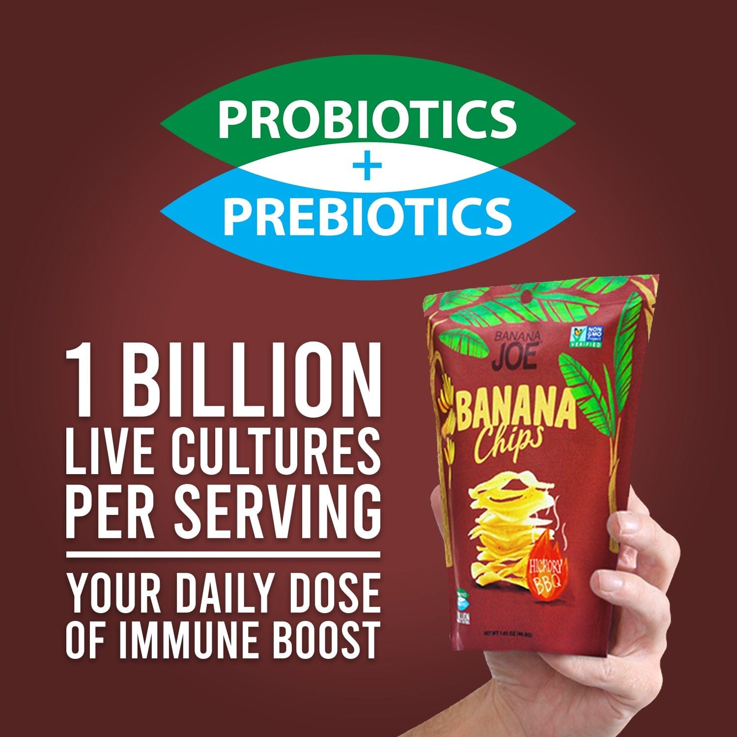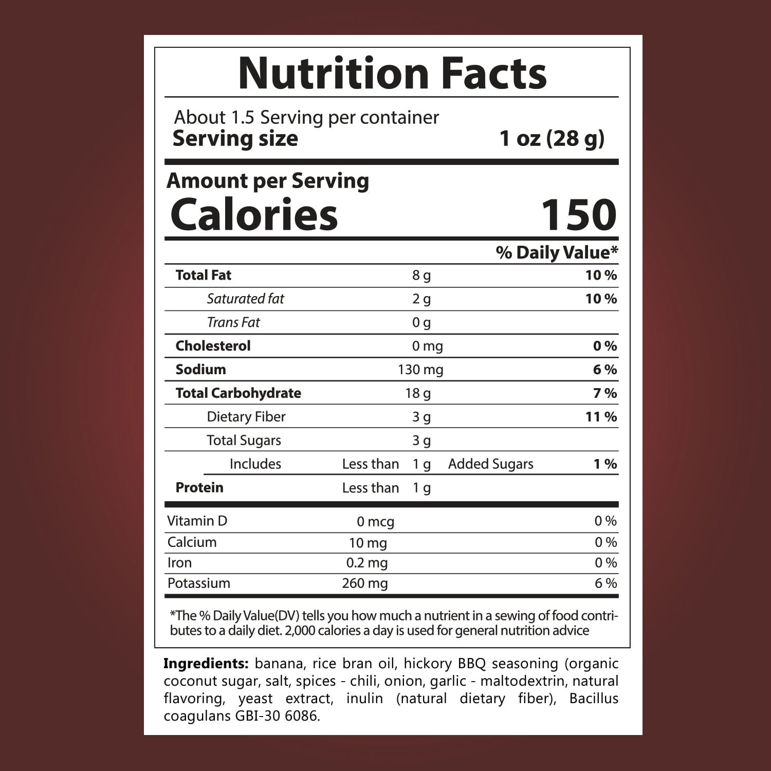 Banana (62.9%), Rice Bran Oil, BBQ Seasoning (6.5%) (Organic Coconut Sugar, Salt, Chilli Powder, Onion Powder, Garlic Powder, Tapioca Maltodextrin, Natural Flavours, Yeast Extract), Inulin, Probiotic (Bacillus Coagulans GBI-30 6086).