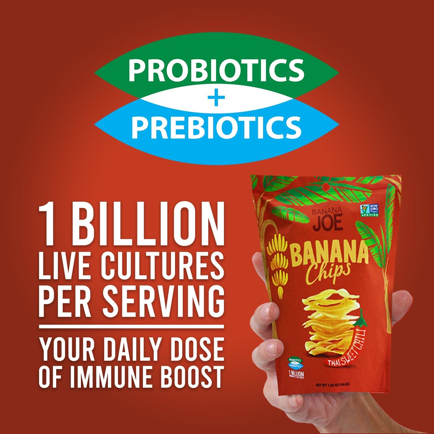Banana (63%), Rice Bran Oil, Thai Sweet Chilli Seasoning (6.4%) (Organic Coconut Sugar, Salt, Chilli, Onion Powder, Garlic Powder, Vinegar Powder (White Vinegar, Tapioca Maltodextrin), Yeast Extract, Natural Flavouring, Acid (Citric Acid)), Inulin, Probiotic (Bacillus Coagulans GBI-306086).