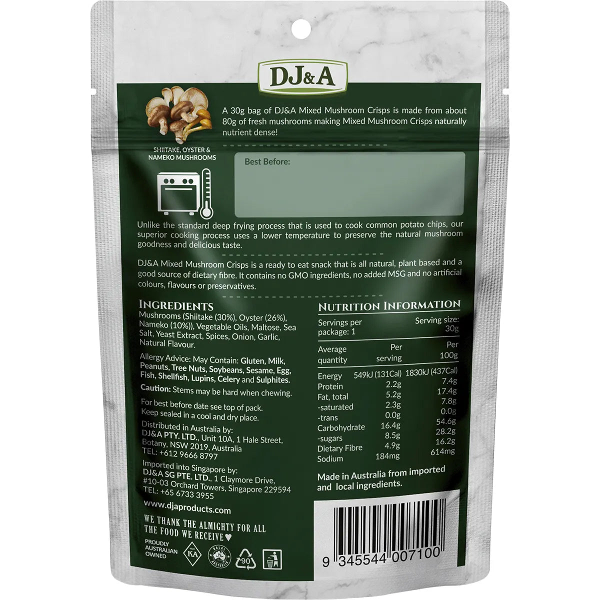 DJ&A Mixed Mushroom Crisps is a ready to eat snack that is all natural, plant based and a good source of dietary fibre. It contains no GMO ingredients, no added MSG and no artificial colours, flavours or preservatives.