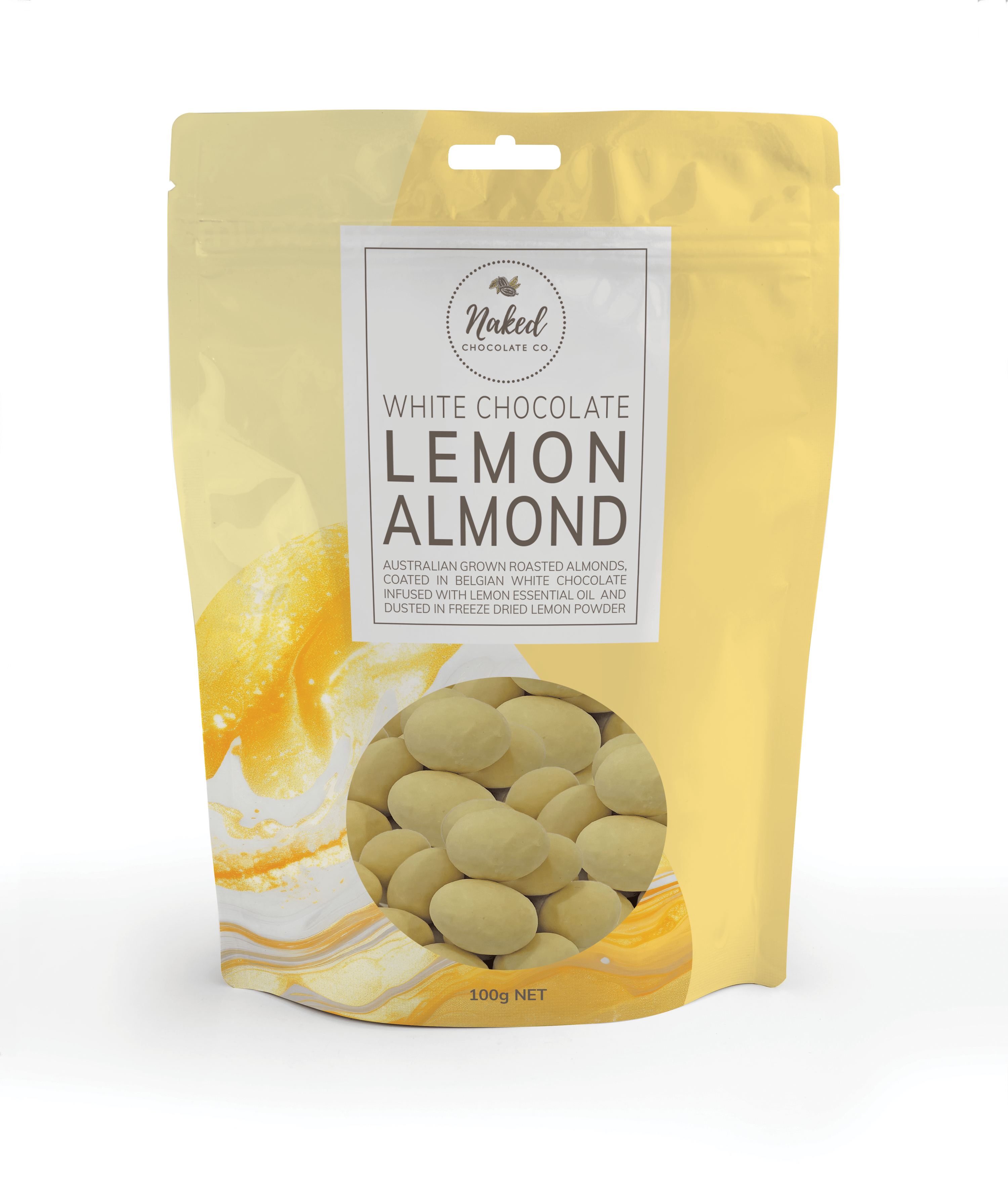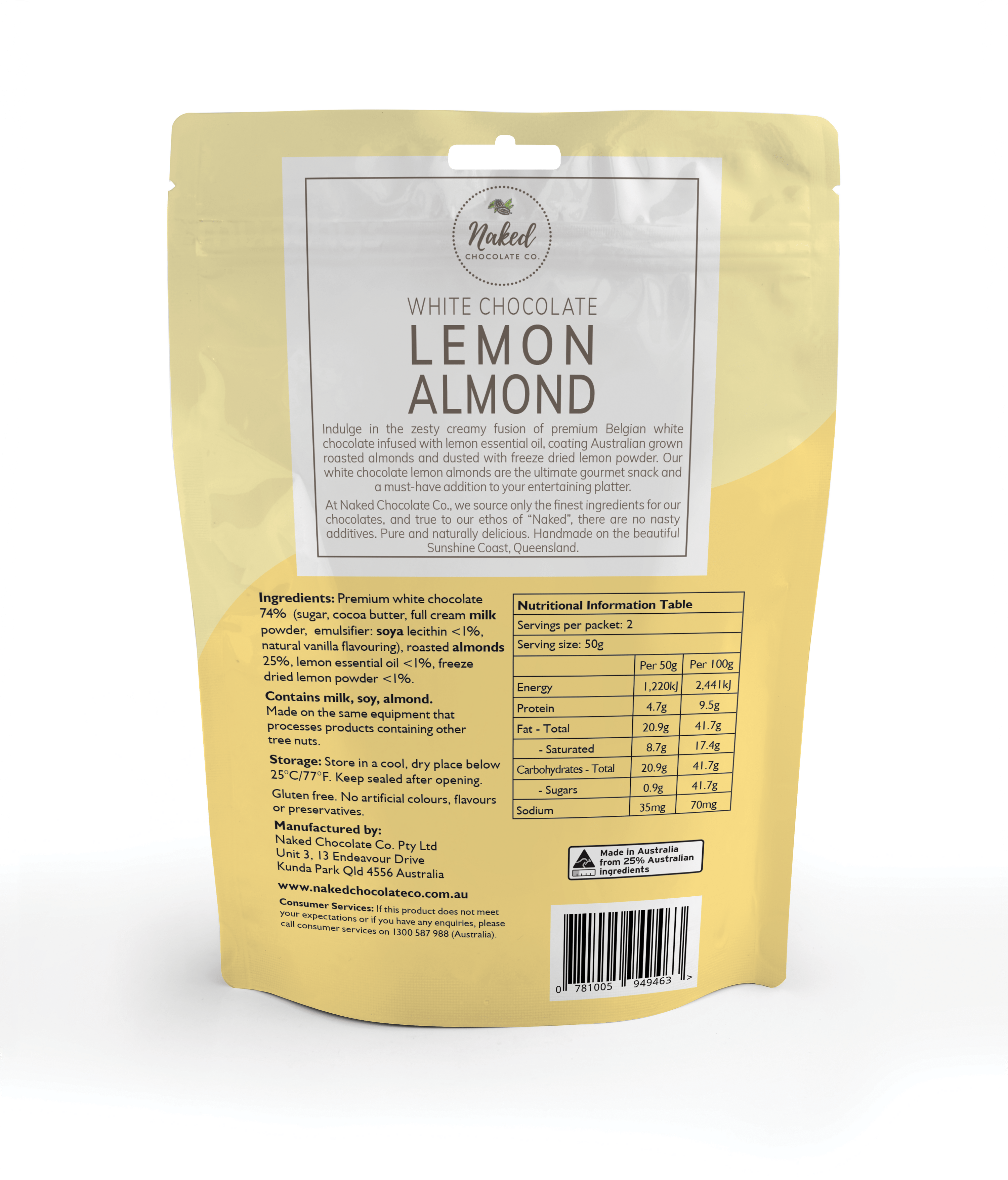 True to our ethos of 'Naked', there are no nasty ingredients - just roasted almonds in premium Belgian white chocolate, scented with freeze dried lemon powder and essential oil.