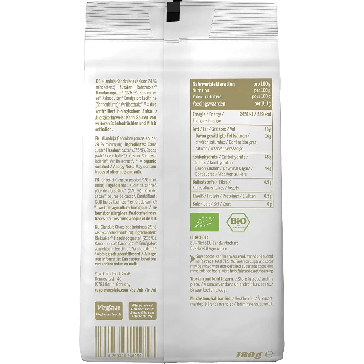 Gianduja Chocolate (cocoa solids: 29 % minimum). Ingredients: Cane sugar*, Hazelnut paste* (27,5 %), Cocoa paste*, Cocoa butter*, Emulsifier: Sunflower lecithin*, Vanilla extract*. * = organic certified / Allergy Note: May contain traces of other nuts and milk.
