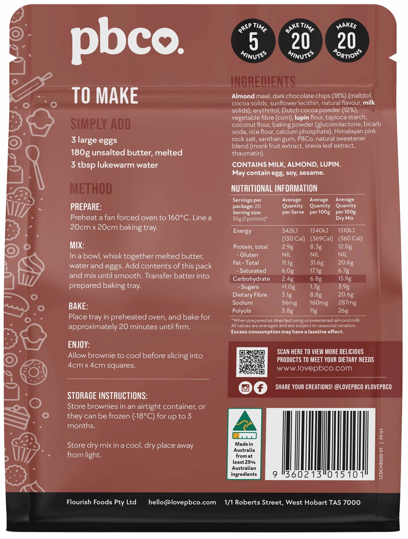 Almond Meal, Dark Chocolate Chips (18%) (Maltitol, Cocoa Solids, Sunflower Lecithin, Natural Flavour, Milk Solids), Erythritol, Dutch Cocoa Powder (12%), Vegetable Fibre (Corn), Lupin Flour, Tapioca Starch, Coconut Flour, Baking Powder (Gluconolactone, Bicarb Soda, Rice Flour, Calcium Phosphate), Himalayan Pink Rock Salt, Xanthan Gum, Pbco. Natural Sweetener Blend (Monk Fruit Extract, Stevia Leaf Extract, Thaumatin).