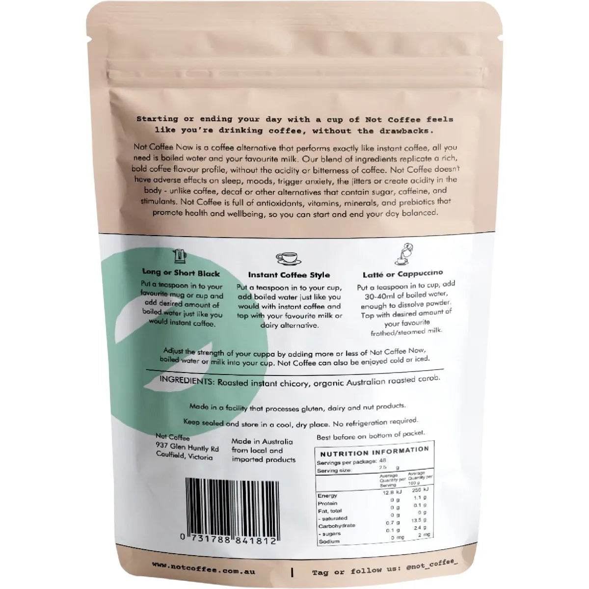 Not Coffee Now is an INSTANT caffeine and stimulant-free coffee alternative designed specifically for coffee lovers who need or want to eliminate caffeine due to health reasons or lifestyle choices. Expertly crafted to replicate your coffee ritual, it looks, brews, and tastes as close to real coffee as possible - minus the acidity and unwanted side effects.