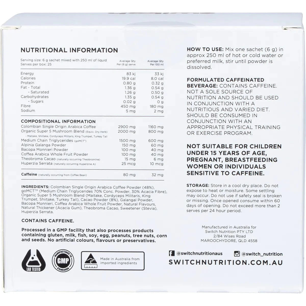 Colombian Single Origin Arabica Coffee Powder (57%), goMCT™ (Medium Chain Triglycerides 70% Conc. Powder, 30% Acacia Fibre), Organic Super 5 Mushroom Blend (Maitake, Cordyceps Militaris, King Trumpet, Shiitake, Turkey Tail), Galangal Powder, Bacopa Monnieri, Coffea Arabica Whole Fruit Powder, Natural Flavours, Natural Thickener (Acacia Gum), Theobroma Cacao, Sweetener (Stevia), Huperzia Serrata.