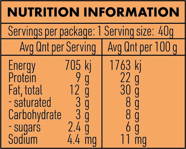 Peanuts, Pasture Raised Collagen, Peanut Butter, Almonds, Prebiotic Chicory Root fibre, Tahini, Cacao Powder, Cacao Mass, Coconut, MCT Oil, Monk Fruit, Natural Caramel Flavour, Himilayan Salt