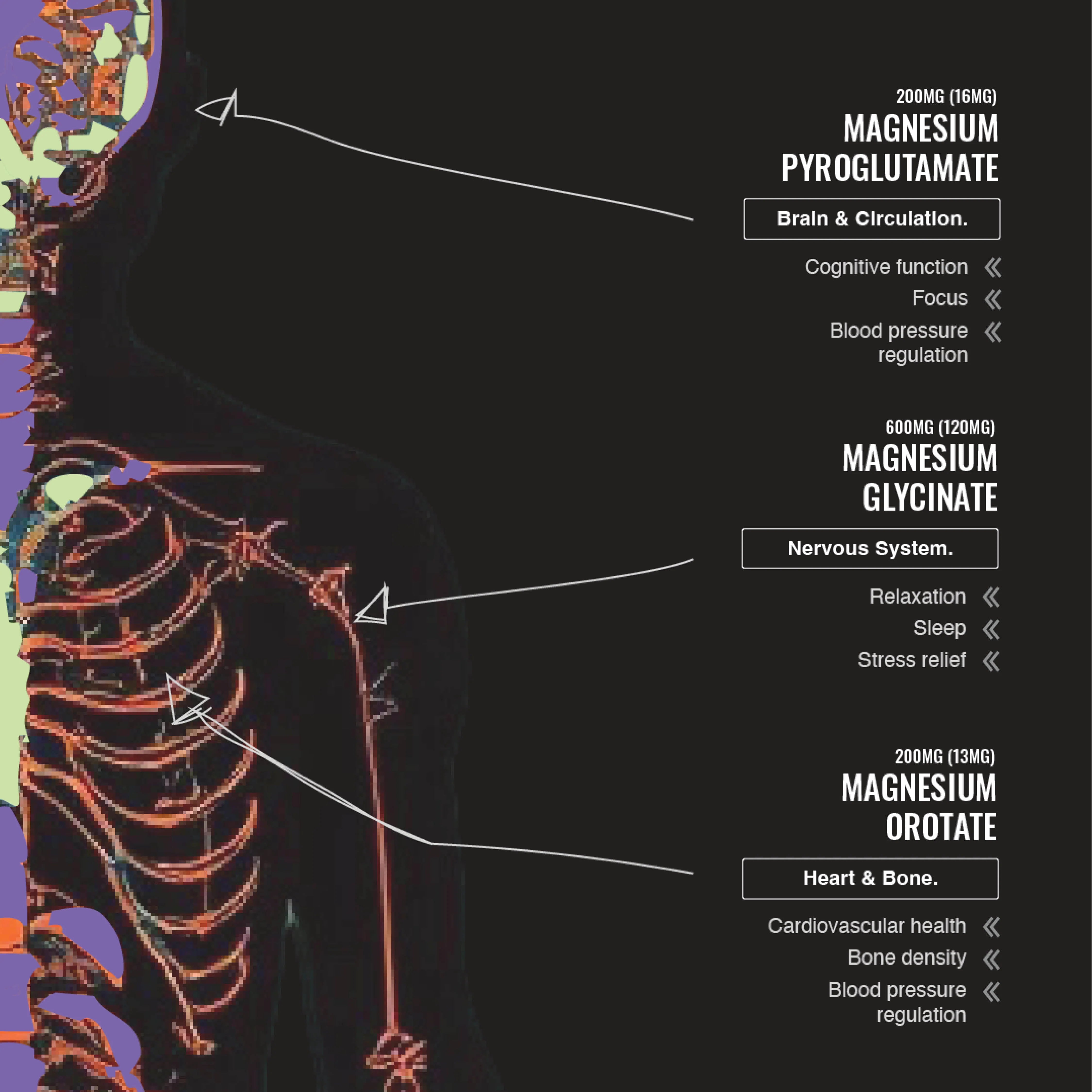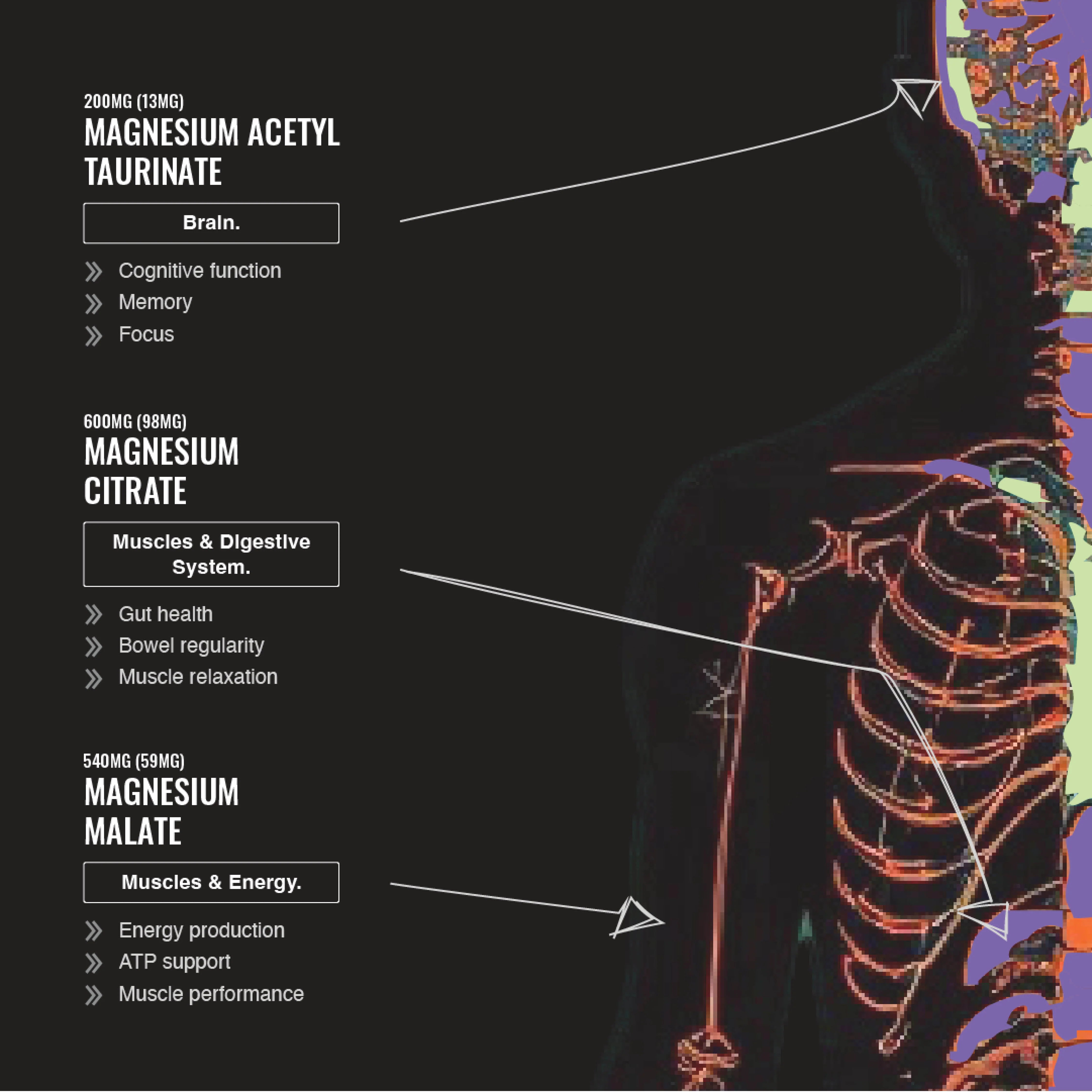 Designed for athletes who demand more from their recovery, Multi-Mag combines 6 highly bioavailable forms of magnesium with B6, Vitamin C, and Zinc to maximise absorption and results.