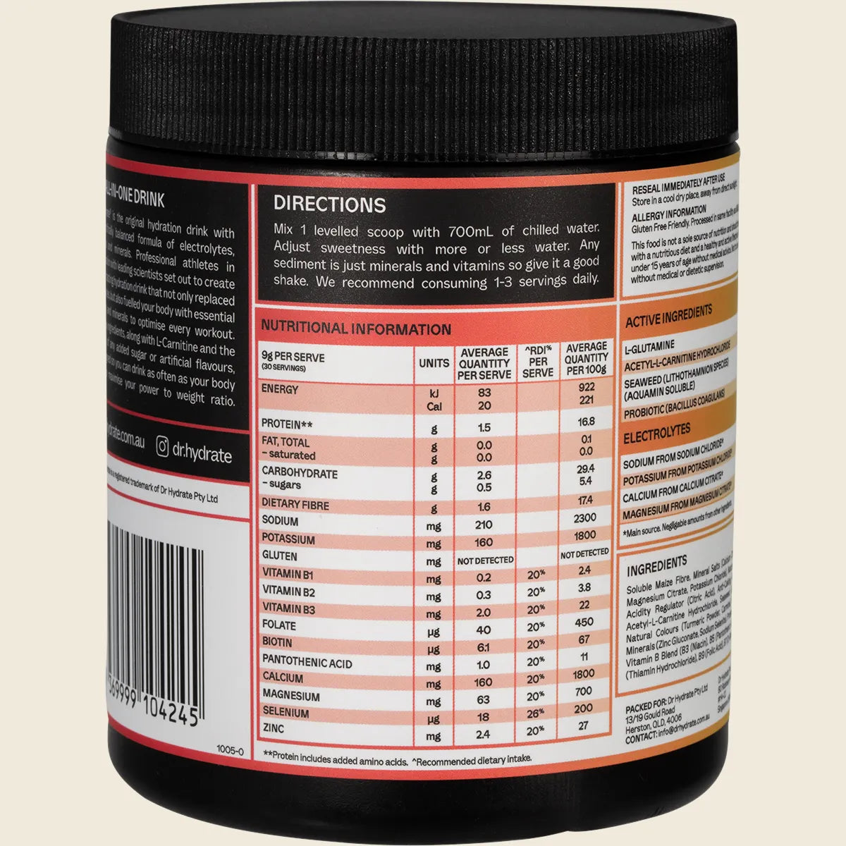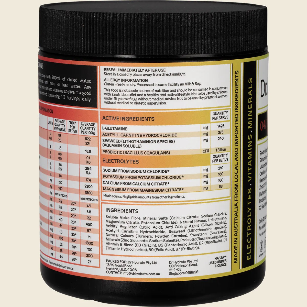 Soluble Maize Fibre, Mineral Salts (Calcium Citrate, Sodium Chloride, Magnesium Citrate, Potassium Chloride), Natural Flavour, L-Glutamine, Acidity Regulator (Citric Acid), Anti-Caking Agent (Silicon Dioxide), Acetyl-L-Carnitine Hydrochloride, Seaweed (Lithothamnion species), Natural Colours (Turmeric Powder, Carmine), Sweetener (Sucralose), Minerals (Zinc Gluconate, Sodium Selenite), Probiotic (Bacillus coagulans), Vitamin B Blend (B3 (Niacin), B5 (Pantothenic Acid), B2 (Riboflavin), B1 (Thiamin Hydrochloride), B9 (Folic Acid), B7 (D-Biotin)).
