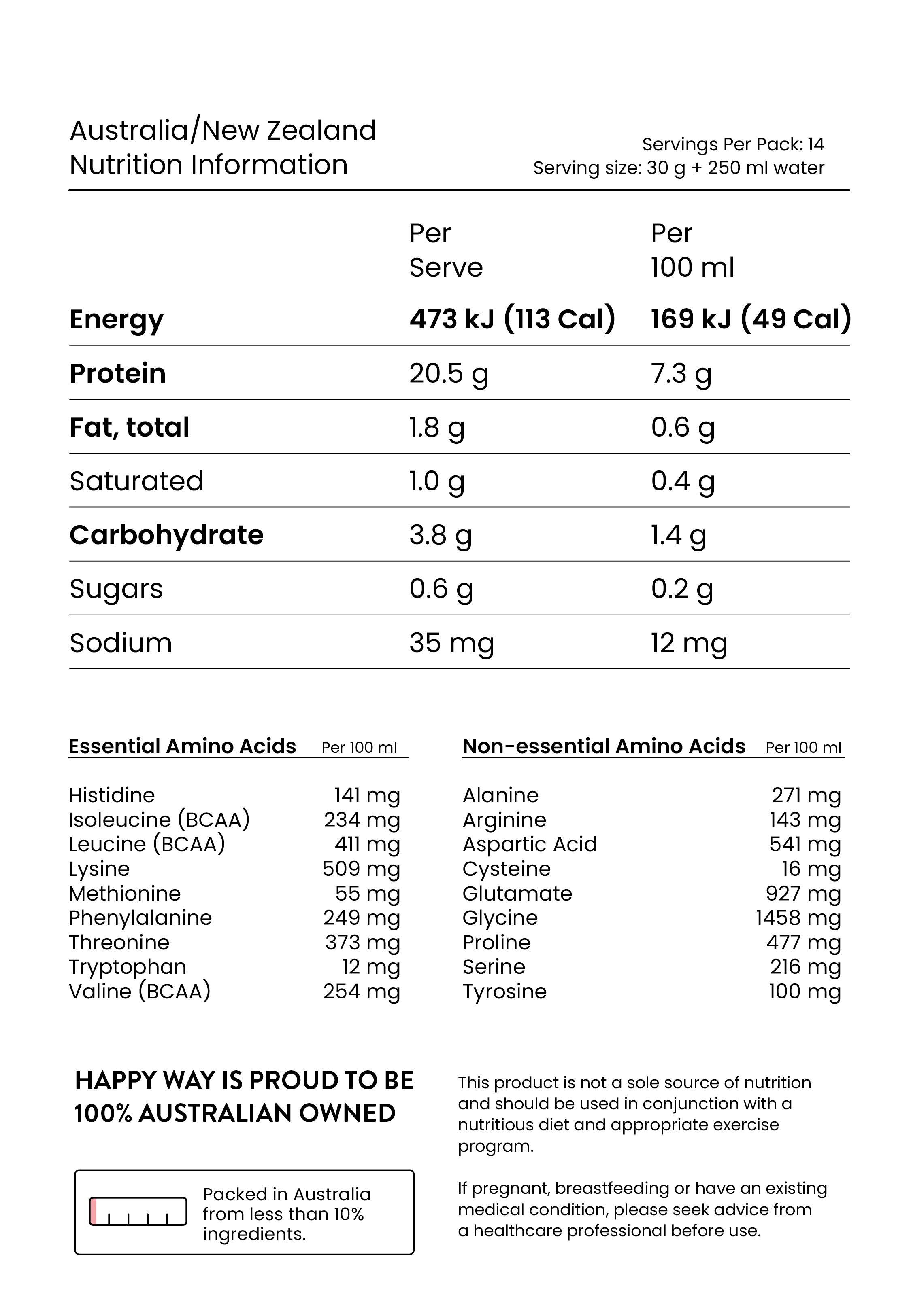 Amino Acid Blend [75% Alanine, Glycine, Valine, Leucine, Isoleucine, Proline, Phenylalanine, Tyrosine, Seine, Threonine, Methionine, Arginine, Histidine, Lysine, Aspartic Acid, Glutamate, Tryptophan, Cysteine], Natural Flavours, Chicory Root Fiber, Acacia Gum Fiber, Coconut Water Powder, Go Mct (Medium Chain Triglycerides), Hydrolised Pea Protein, Electrolyte Blend 1.8% [Potassium Citrate, Magnesium Citrate, Sodium Chloride, Calcium Citrate], Vitamin C, Food Acids (Citric Acid), Beetroot Powder, Sweetener (Stevia & Thaumatin)