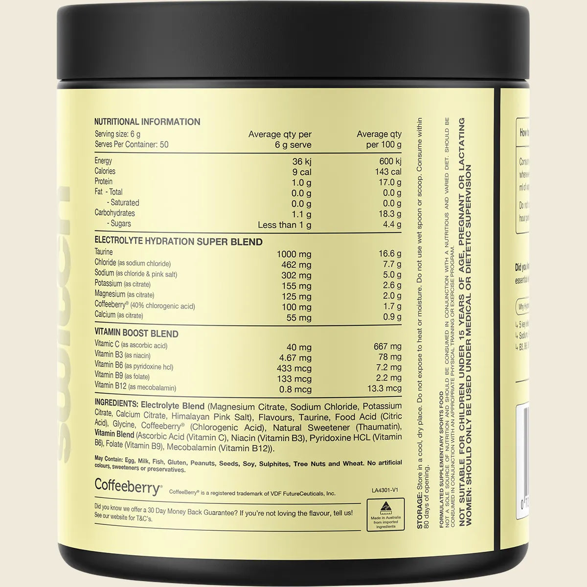 | Electrolyte Blend (Magnesium Citrate, Sodium Chloride, Potassium Citrate, Calcium Citrate, Himalayan Pink Salt), Flavours, Taurine, Food Acid (Citric Acid), Glycine, Coffeeberry® (Chlorogenic Acid), Natural Sweetener (Thaumatin), Vitamin Blend (Ascorbic Acid (Vitamin C), Niacin (Vitamin B3), Pyridoxine HCL (Vitamin B6), Folate (Vitamin B9), Mecobalamin (Vitamin B12)). | ||