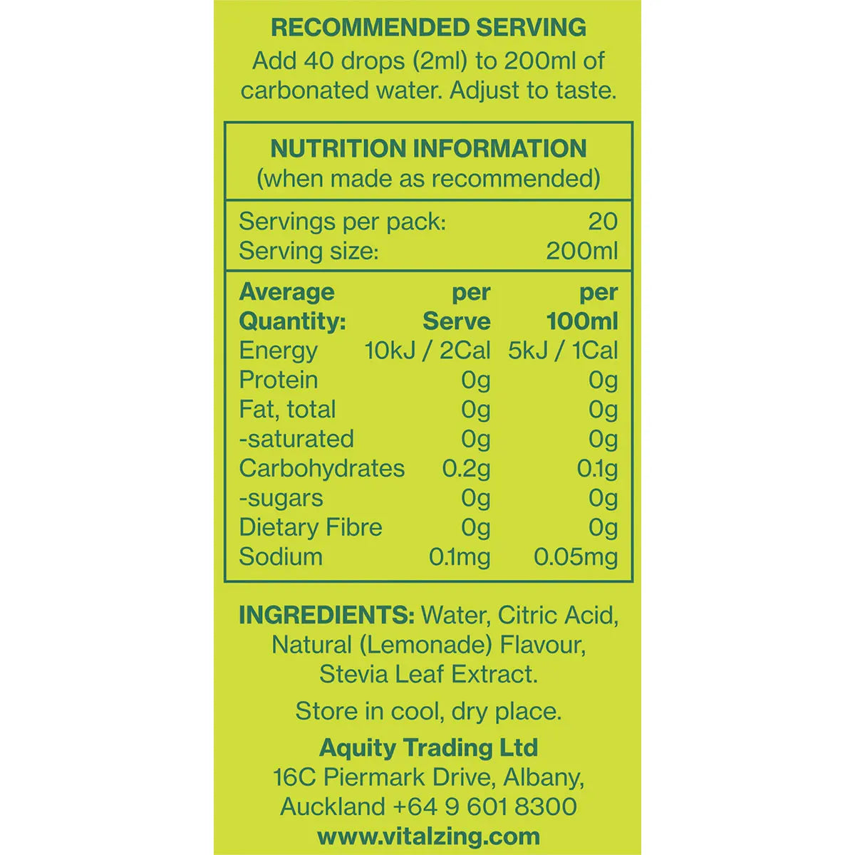 Water, Citric Acid, Natural (Lemonade) Flavour, Stevia Leaf ExtractVital Zing Soda Drops Lemonade 40ml