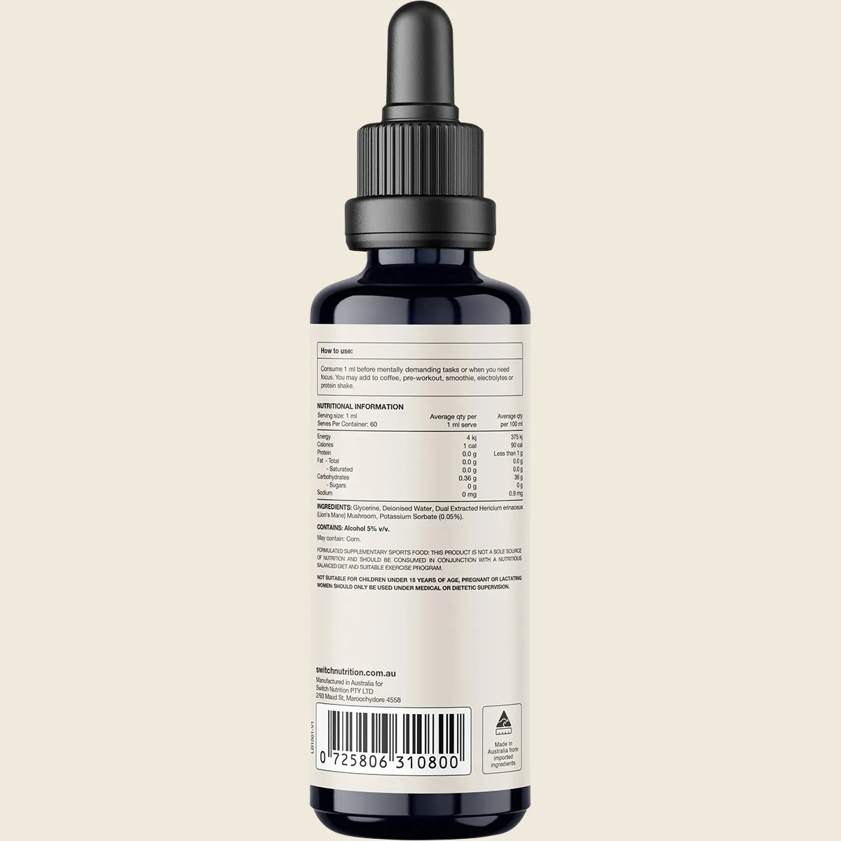 Glycerine, Deionised Water, Dual Extracted Hericium Erinaceus (Lion's Mane) Mushroom, Potassium Sorbate (0.05%).Contains: Alcohol 5% V/V.