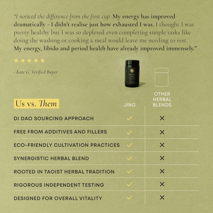 The heart of JING's effectiveness lies in the Dì Dào approach to sourcing, ensuring each ingredient's highest quality and potency, direct from China's renowned herbal regions. This method preserves the profound, time-tested wisdom of herbal medicine.