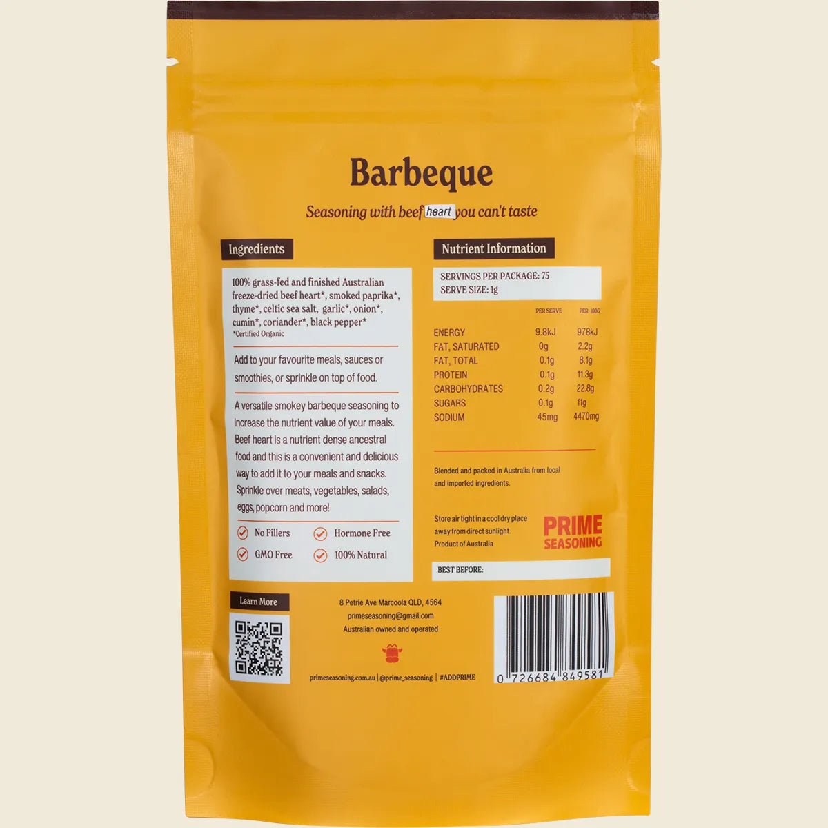 A bold, smoky barbecue-style seasoning crafted with organic herbs, spices and 100% grass-fed Australian freeze-dried beef heart. Designed to boost the nutrient value of your meals—without the strong organ meat flavour.