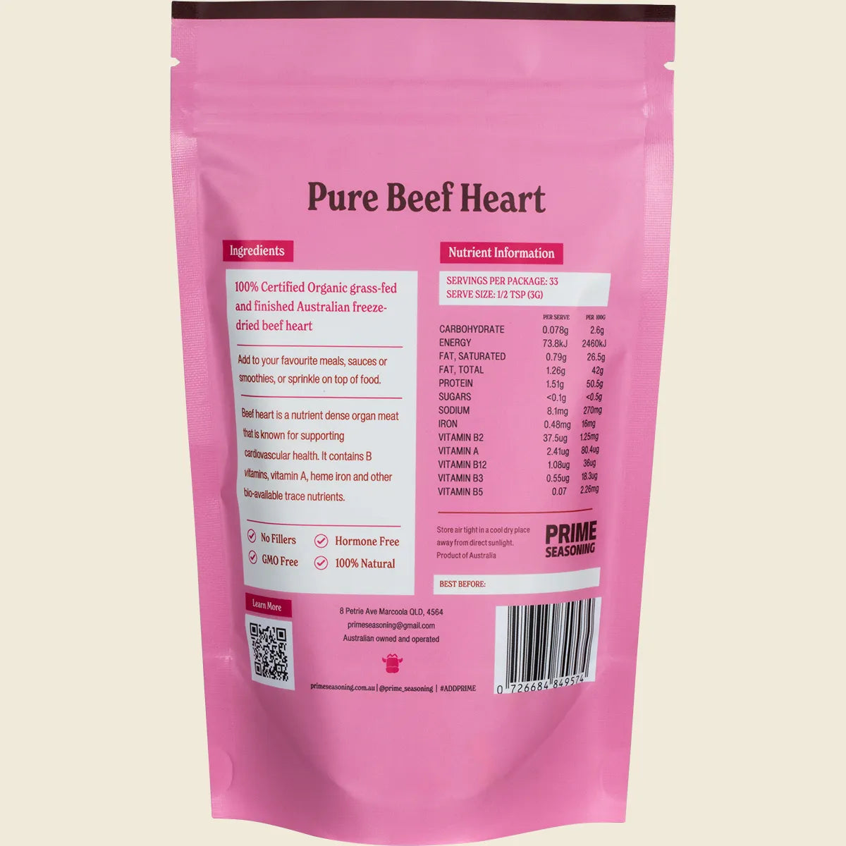 Prime Seasoning Organic Pure Freeze Dried Beef Heart Powder 100g