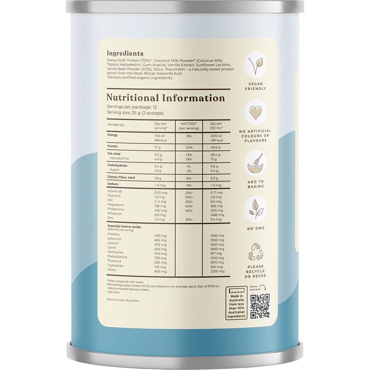 Hemp Gold Protein (75%)*, Coconut Milk Powder*, Vanilla Extract, Sunflower Lecithin, Vanilla Bean Powder (0.3%), Silica, Thaumatin(0.09%) (Protein Extract from the West African Katemfe Fruit). *Denotes Certified Organic Ingredients