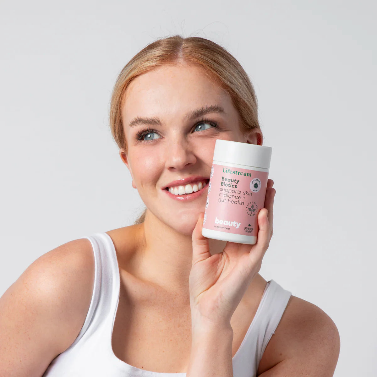 Lifestream Beauty Biotics supports gut health and glowing skin from within. Research shows that a balanced gut microbiome contributes to healthy, radiant skin. Taken daily as part of your beauty and gut health routine, this delicious red formula helps to nourish and support your skin hydration, and support collagen production, from the inside out.