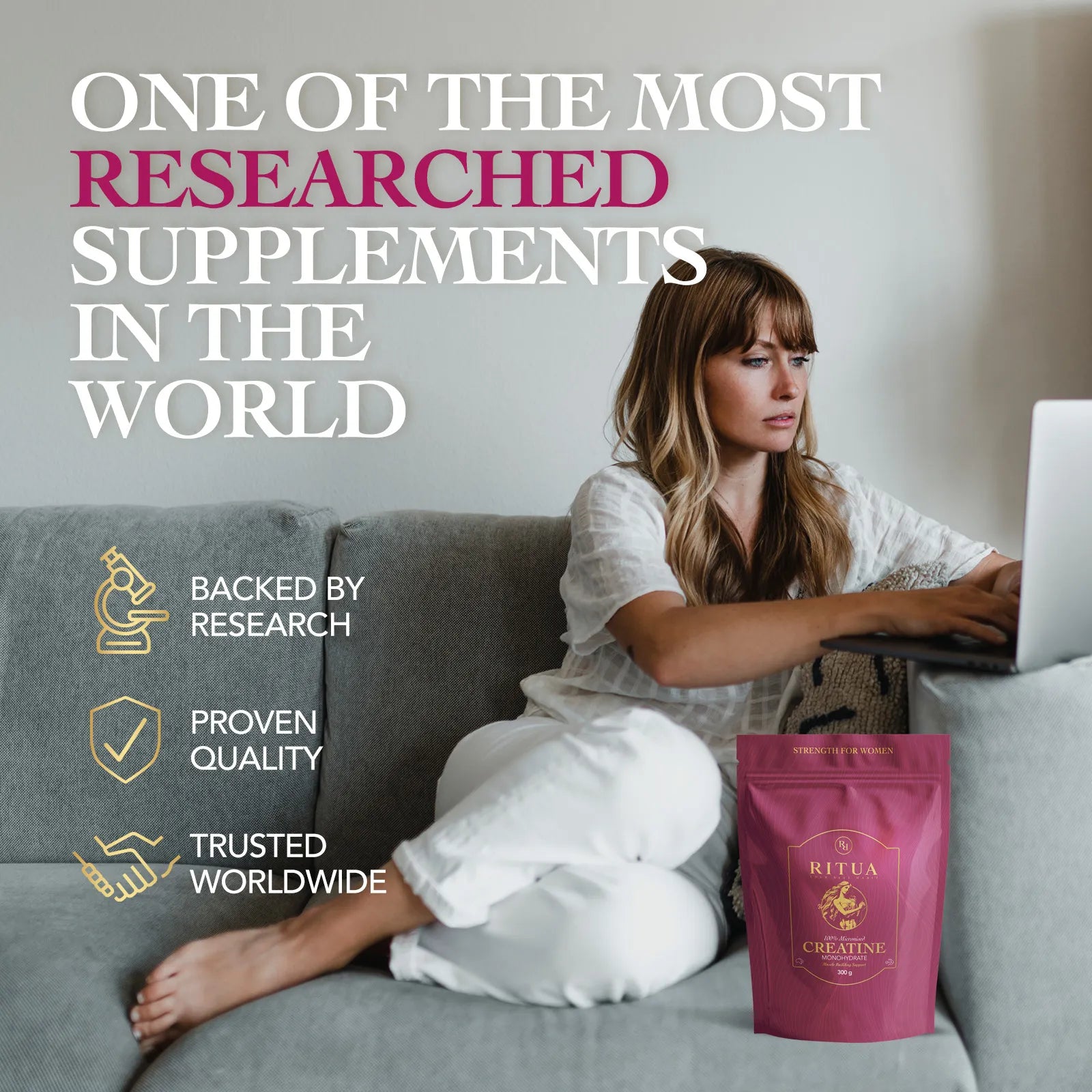 Boost your training with Ritua’s Creatine Monohydrate for Women. A pure, micronised formula designed to support strength, lean muscle tone, and faster recovery. Easy to mix and versatile, it’s the perfect daily addition to your wellness routine. Creatine monohydrate for women is a pure, micronised sports supplement that enhances energy production in muscles. It helps regenerate ATP, the primary energy source for short, explosive efforts, boosting strength, power, and training performance.