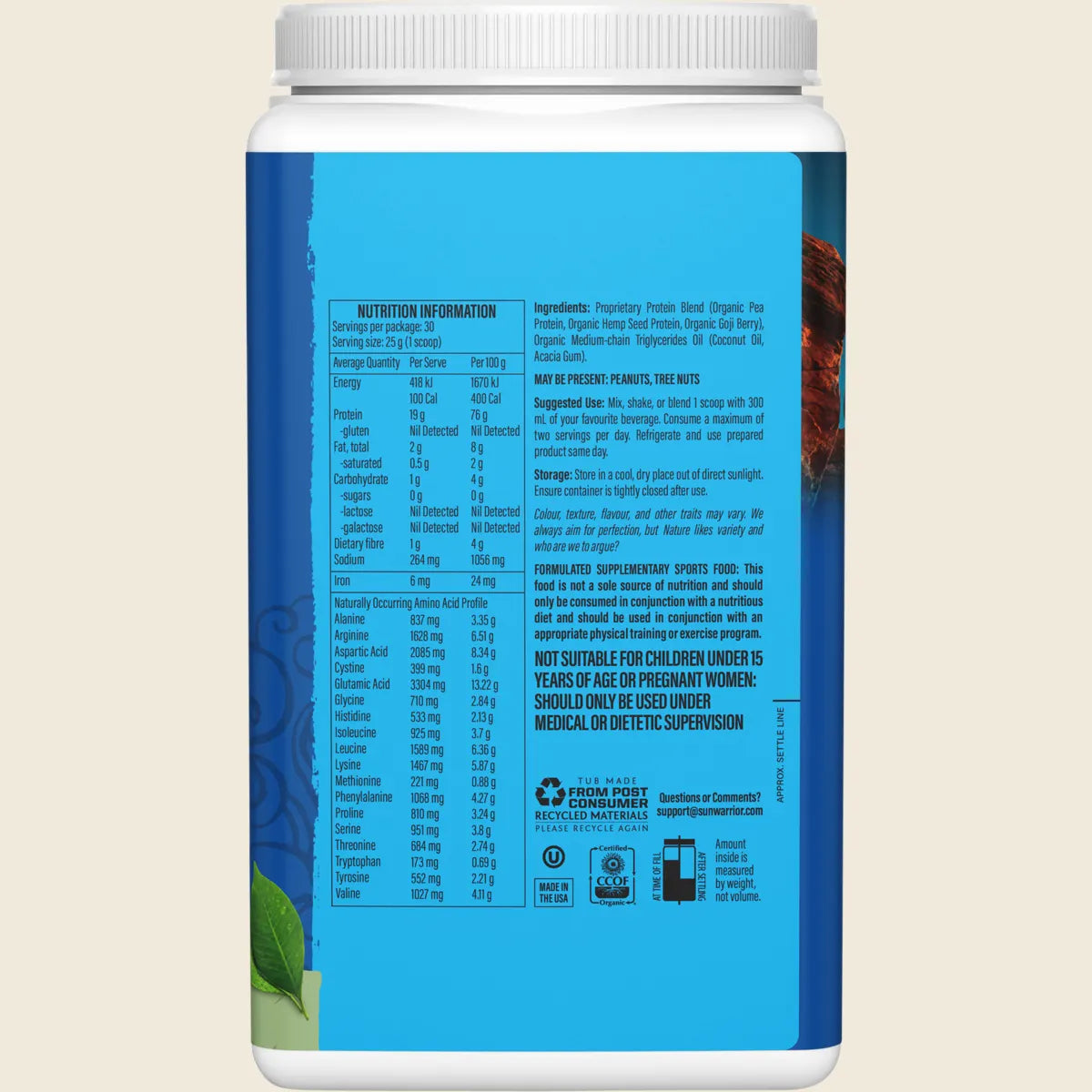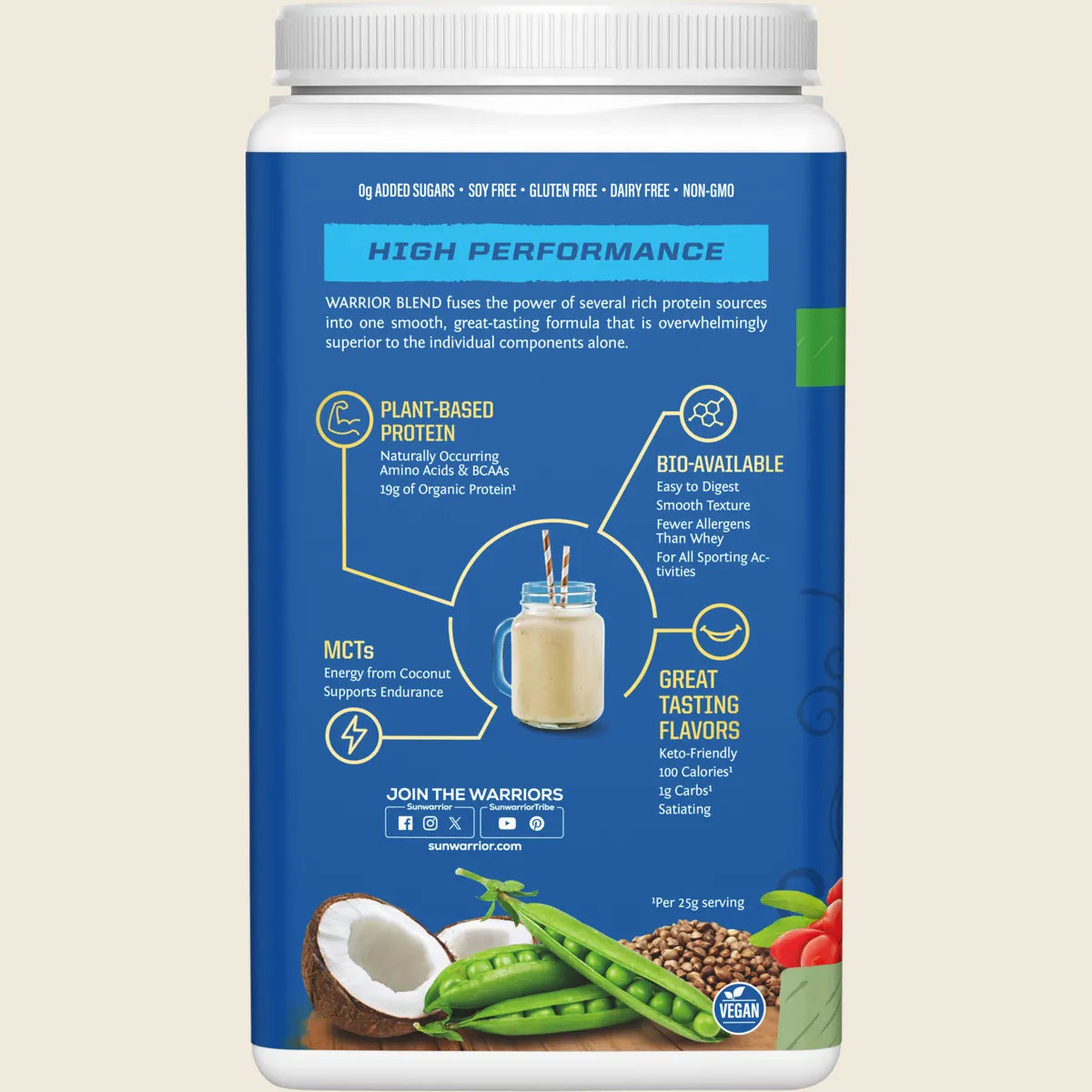 Warrior blend fuses the power of several rich protein sources into one smooth, great-tasting formula that is overwhelmingly superior to the individual components alone. Medium-chain triglycerides from coconut work synergistically with the other ingredients to create a unique vegan protein exceptionally rich in amino acids and BCAAs.