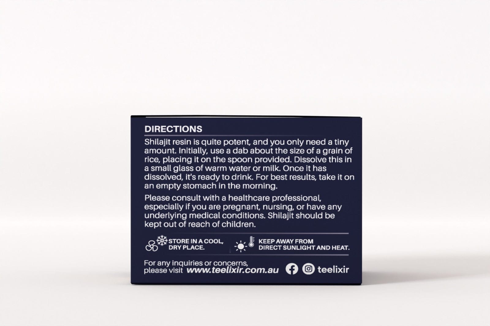 Direction for use: Shilajit resin is quite potent, and you only need a tiny amount. Initially, use a tab about the size of a grain of rice, placing it on the spoon provided. Dissolve this in a small glass of warm water or milk. For best results, take it on an empty stomach in the morning.
