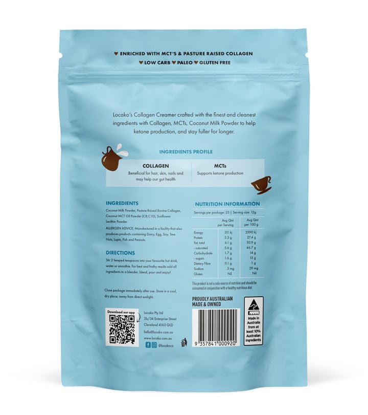 Locako’s Collagen Creamer crafted with the finest and cleanest ingredients with Collagen, MCTs, Coconut Milk Powder to help ketone production, and stay fuller for longer. .