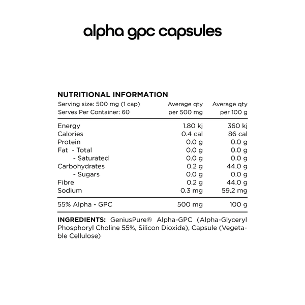 GeniusPure® Alpha-GPC (Alpha-Glyceryl Phosphoryl Choline 55%), Silicon Dioxide, Capsule (Vegetable Cellulose).