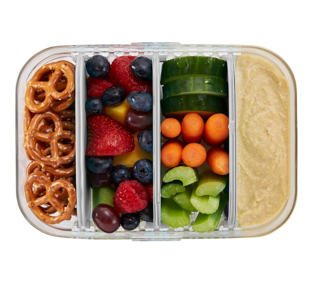 Comparable in size to bento boxes, this container includes removable dividers that wall off thick liquids and solids, letting you separate sensitive foods and create customized spaces.